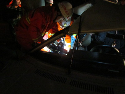 18时27分,消防官兵到达现场。经过经现场侦察后,指挥员立即组织官兵实施救援,命令作战人员利用液压扩张器与液压剪切钳配合破拆哈飞汽车驾驶员左侧车门,由于车体变形严重,车门被打开后被困人员仍无法救出,指挥员命令救援官兵利用液压顶杆顶撑与驾驶座椅空隙处将其救出,与此,官兵利用扩张器将比亚迪轿车车门打开并救出另一名被困人员,经过消防官兵10多分钟的奋力施救,18时42分,两名被困人员被成功救出,并送往医院救治。